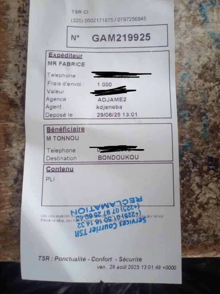 Paiement à la livraison à Abidjan et dépôt avant expédition à l'intérieur du pays.
